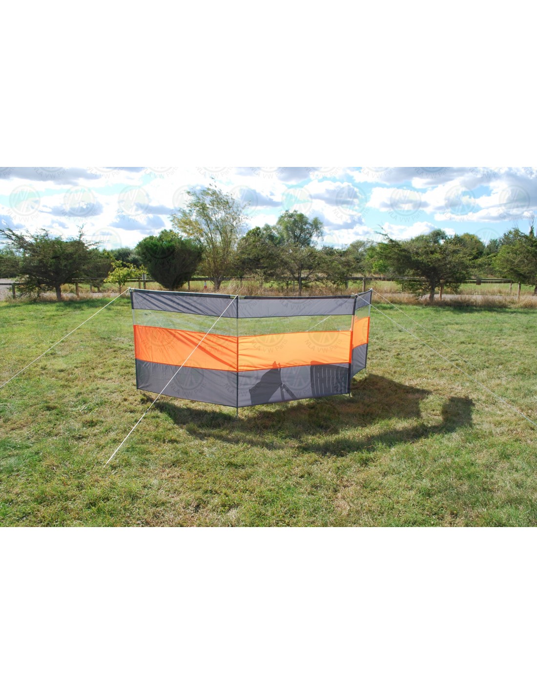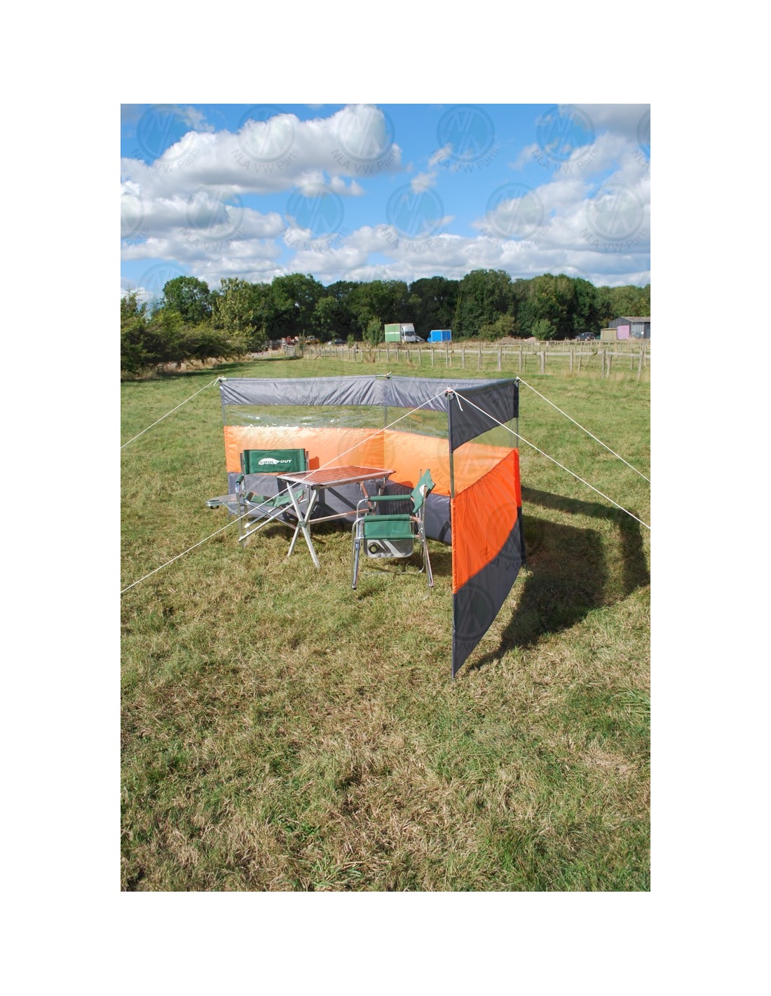 This stylish windbreak is a versatile piece of equipment for camping and for picnics. It comprises 3 panels each with a transparent section at eye height (when sitting). There are 4 vertical steel poles and 3 horizontal steel poles to enhance stability that fit over the top end of the vertical poles. There are also 6 guy ropes and 14 steel pegs to secure the windbreak. This is one of very few windbreaks with horizontal poles along the top edge, this means that the fabric cannot be overstretched when erecting the windbreak, it also reduces the wind load on the fabric.