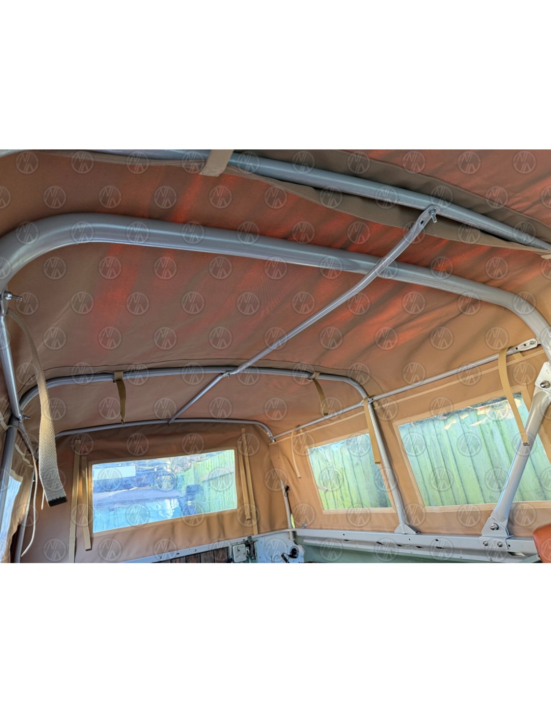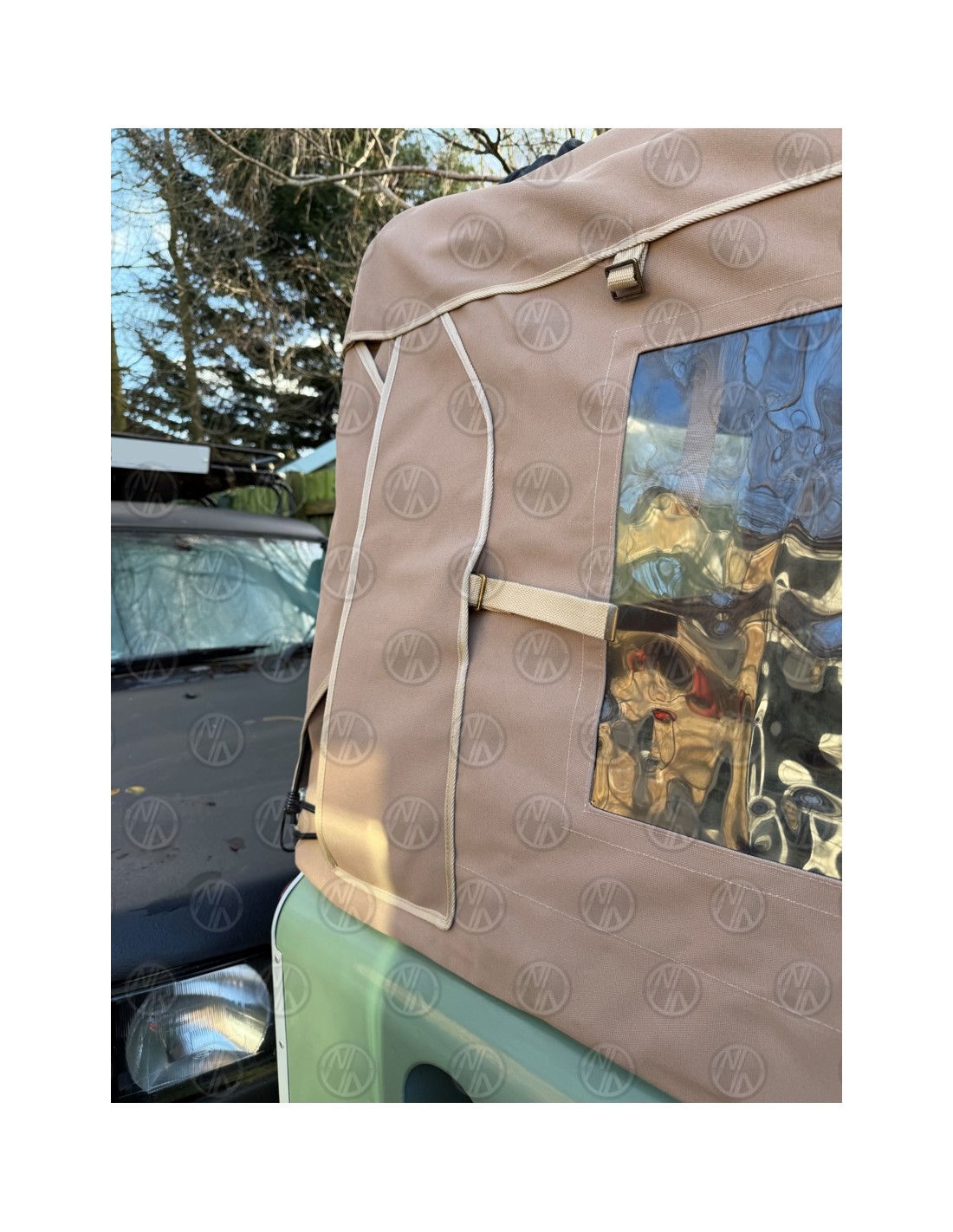 Same grade heavy duty canvas as the original Land Rover canvas in sand, with 5 clear PVC windows in sand for 2-door 110" Land Rover Defender
